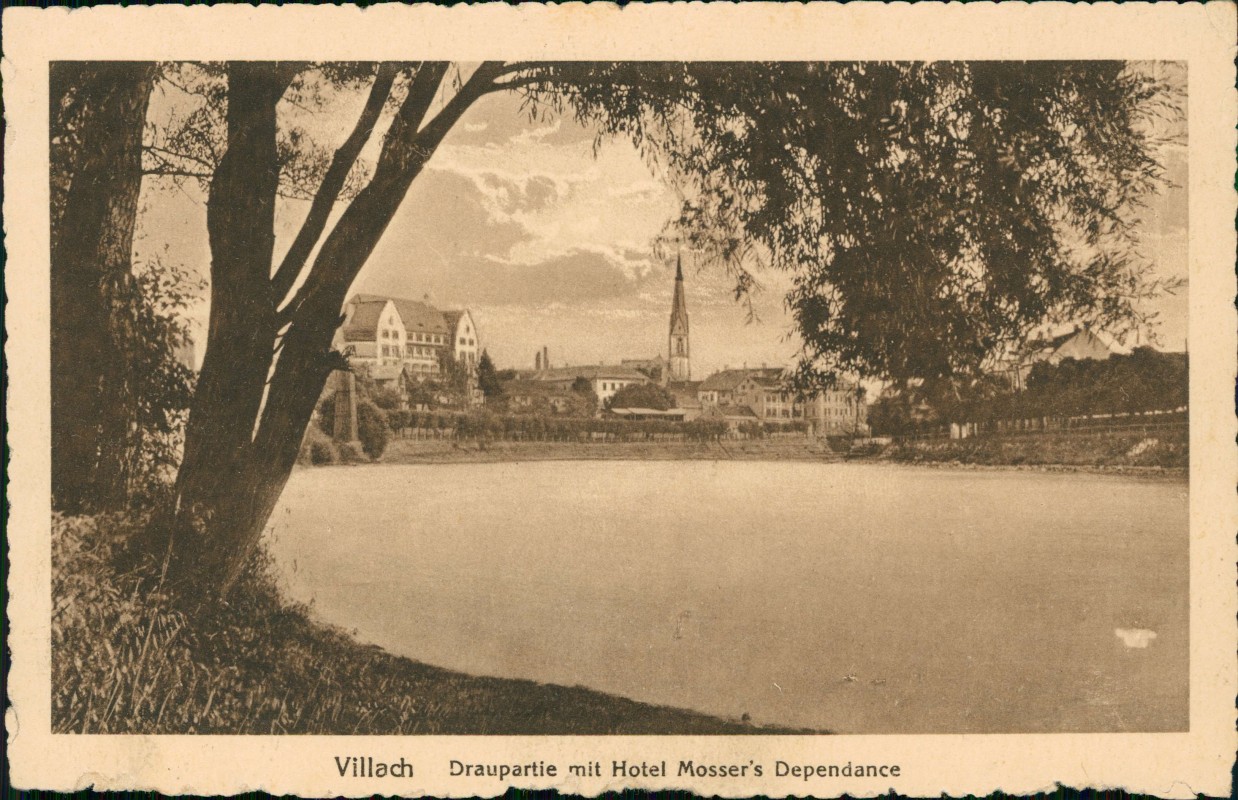 Postcart: Draupartie mit Hotel Mosser's Dependance - Villach