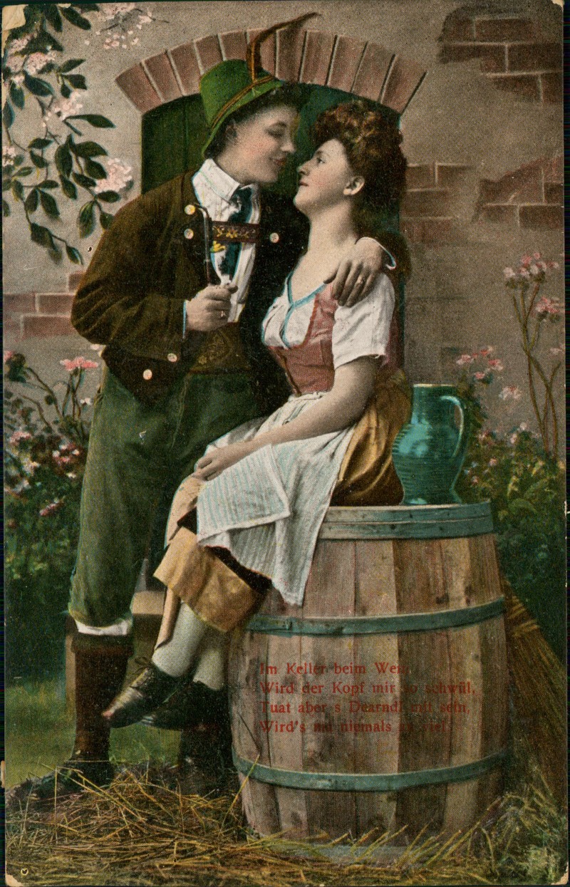 Postcart: Liebe Liebespaar Love in Tracht auf Weinfass Im Keller