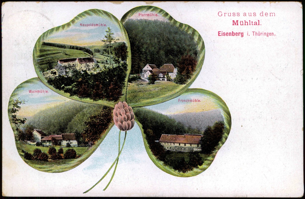 Postcart: Kleeblattlitho mit Mühlen im Mühltal - Eisenberg (Thüringen)