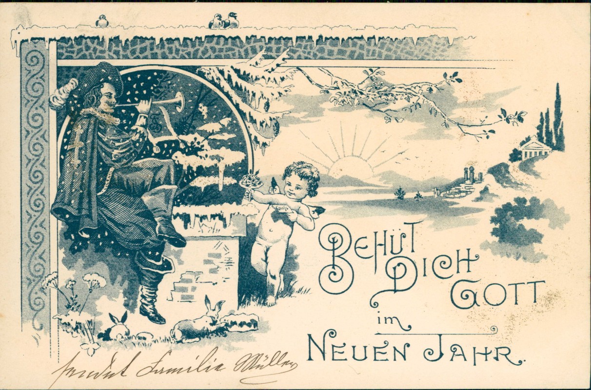 Postcart: Neujahr Sylvester New Year Trompeter Engel Winter