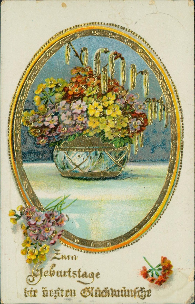 Postcart: Geburtstag Birthday Blumen Vase Goldrahmen