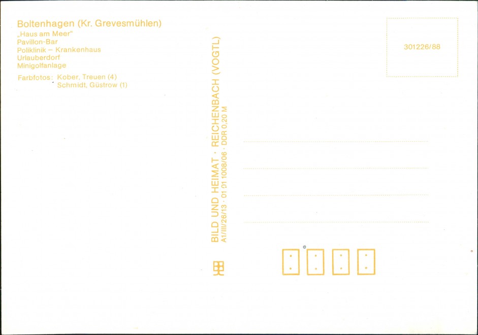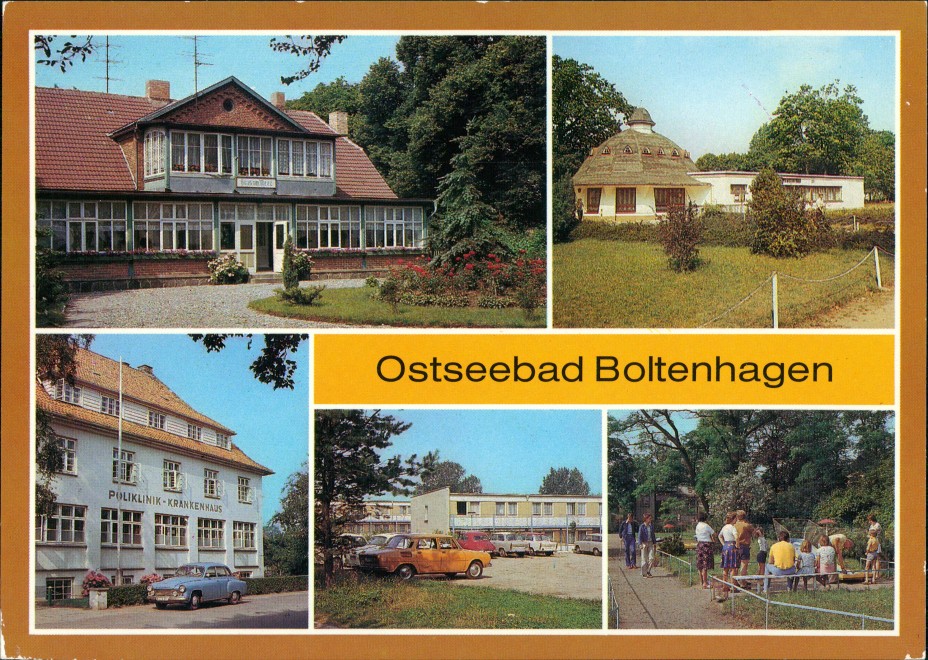 Postcart: "Haus am Meer", Pavillon-Bar, Poliklinik - Krankenhaus, Urlauberdorf, Minigolfanlage - Ostseebad Boltenhagen