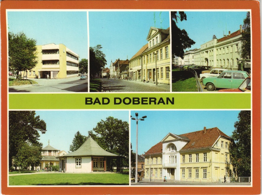 Postcart: Dienstleistungskombinat - Rostocker Straße, Severinstraße, August-Bebel-Straße, Am Kamp, Lessinggoberschule am Karl-Marx-Platz - Bad Doberan