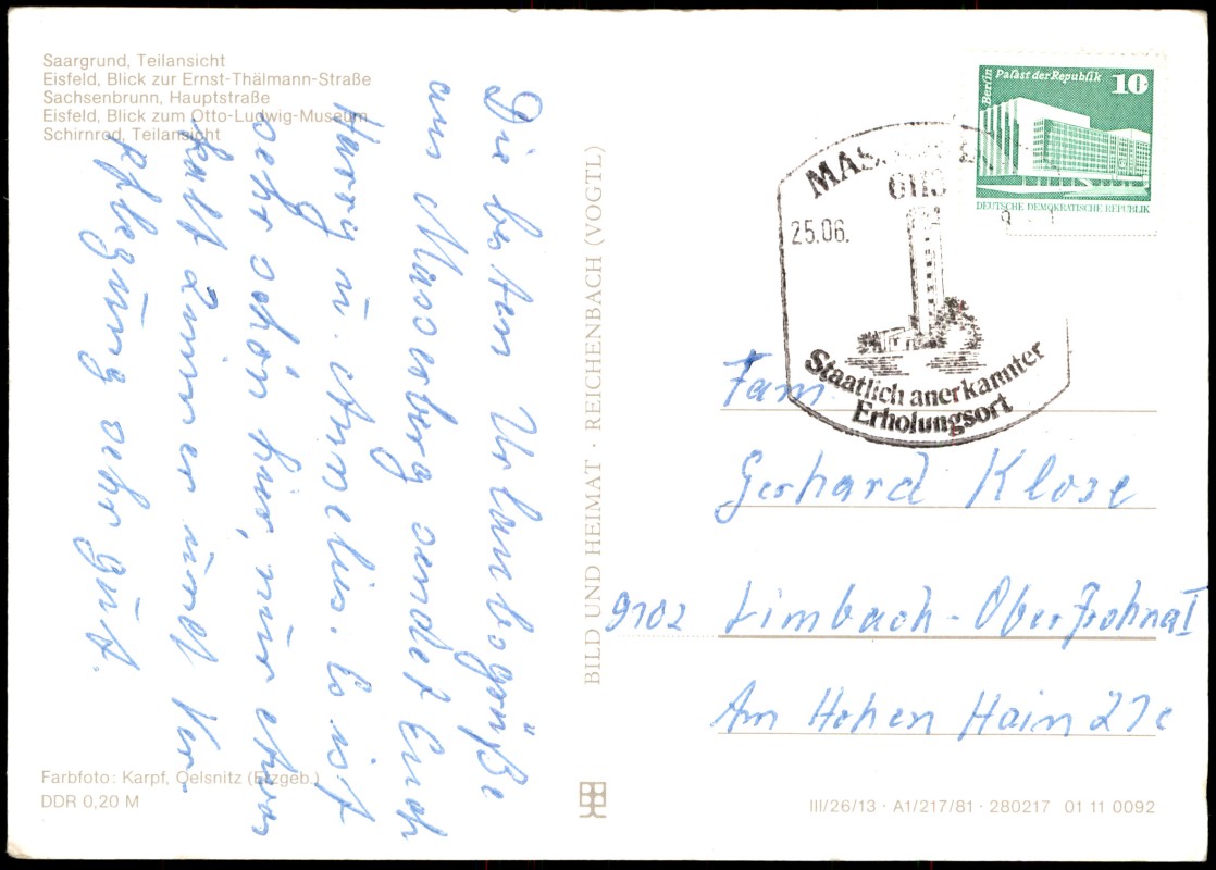 Postcart: Saargrund - Teilansicht, Eisfeld - Blick zur Ernst-Thälmann-Straße, Sachsenbrunn - Hauptstraße, Eisfeld - Blick zum Otto-Ludwig-Museum, Schirnrod - Teilansicht - Eisfeld