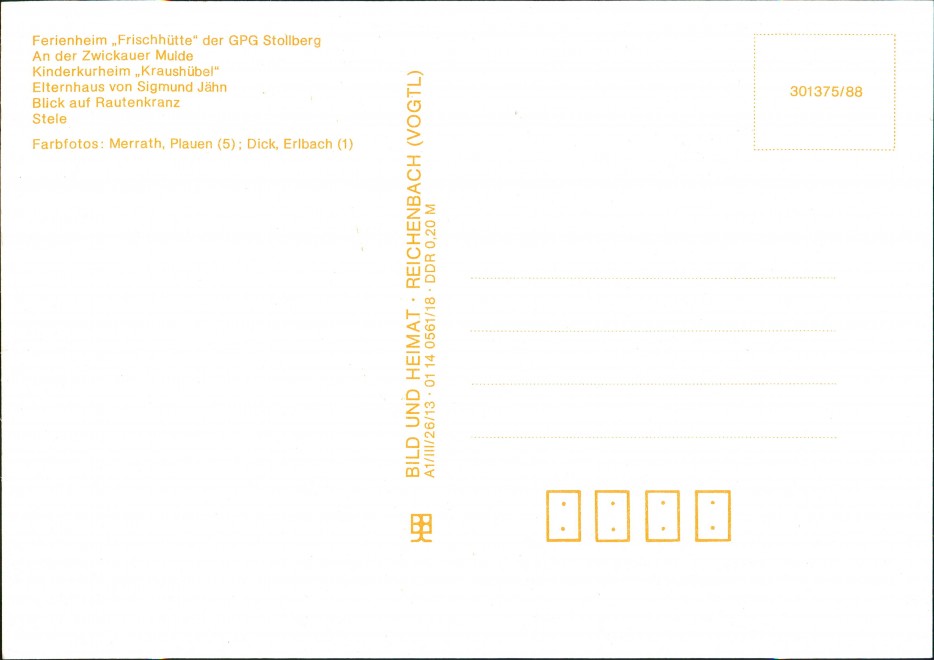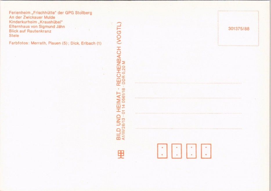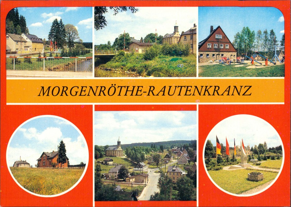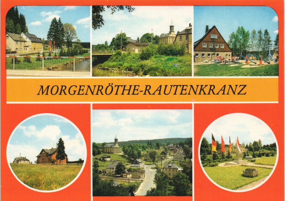 Postcart: Ferienheim "Frischhütte" der Koop -Abteilung GPG Zwickau, An der Großen Pyra, Kinderkurheim "Kraushübel", Elternhaus von Sigmund Jähn, Blick auf Rautenkranz, Stele - Morgenröthe-Rautenkranz
