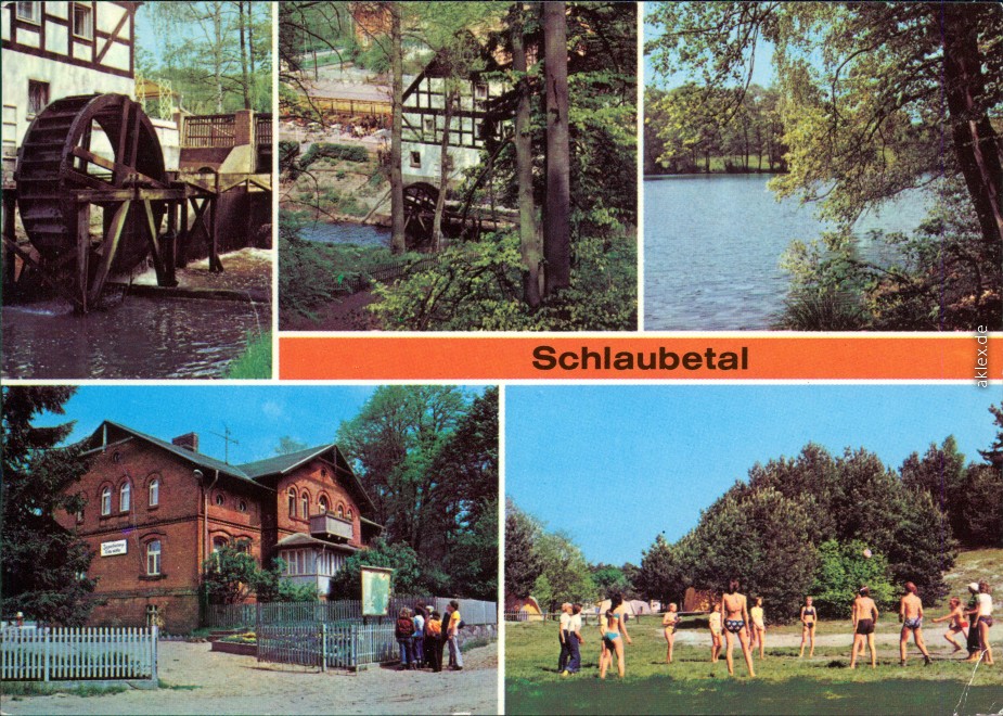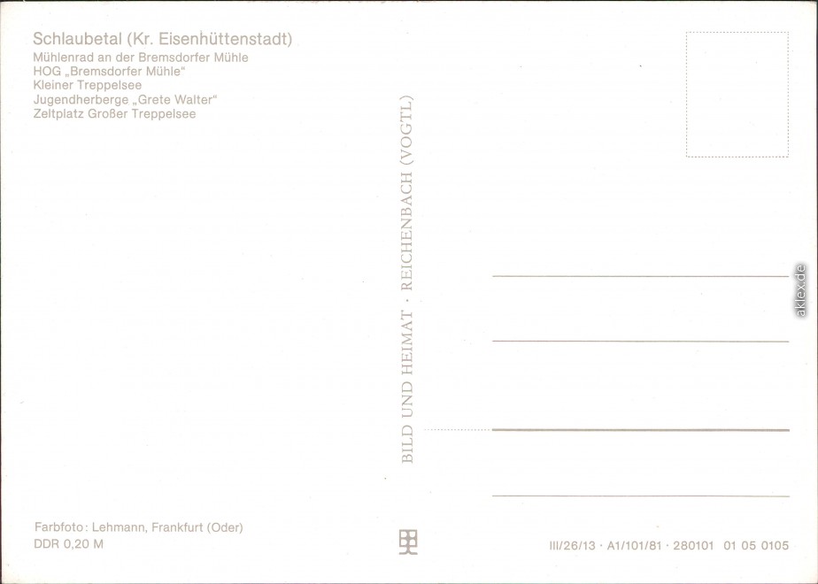 Postcart: Mühlenrad an der Bremersdorfer Mühle, HOG "Bremsdorfer Mühle", Kleiner Treppelsee, Jugendherberge "Grete Walter", Zeltplatz Großer Treppelsee - Schlaubetal
