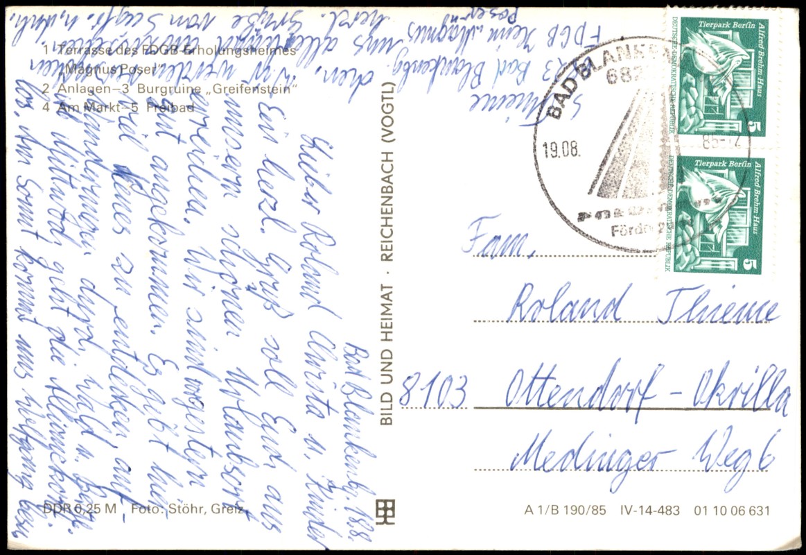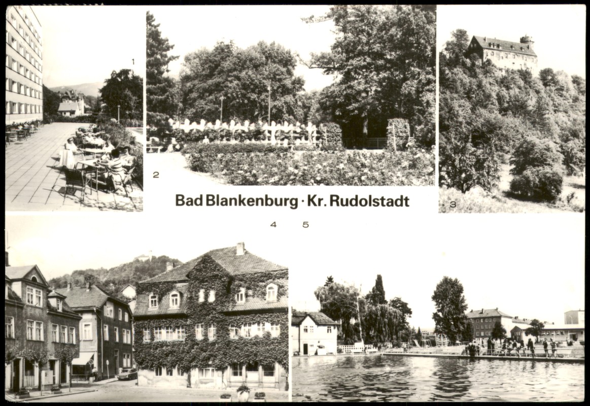 - 1 Terrasse des FDGB-Erholungsheim "Magnus Poser" 2 Anlagen 3 Burgruine "Greifenstein" 4 Markt 5 Freibad