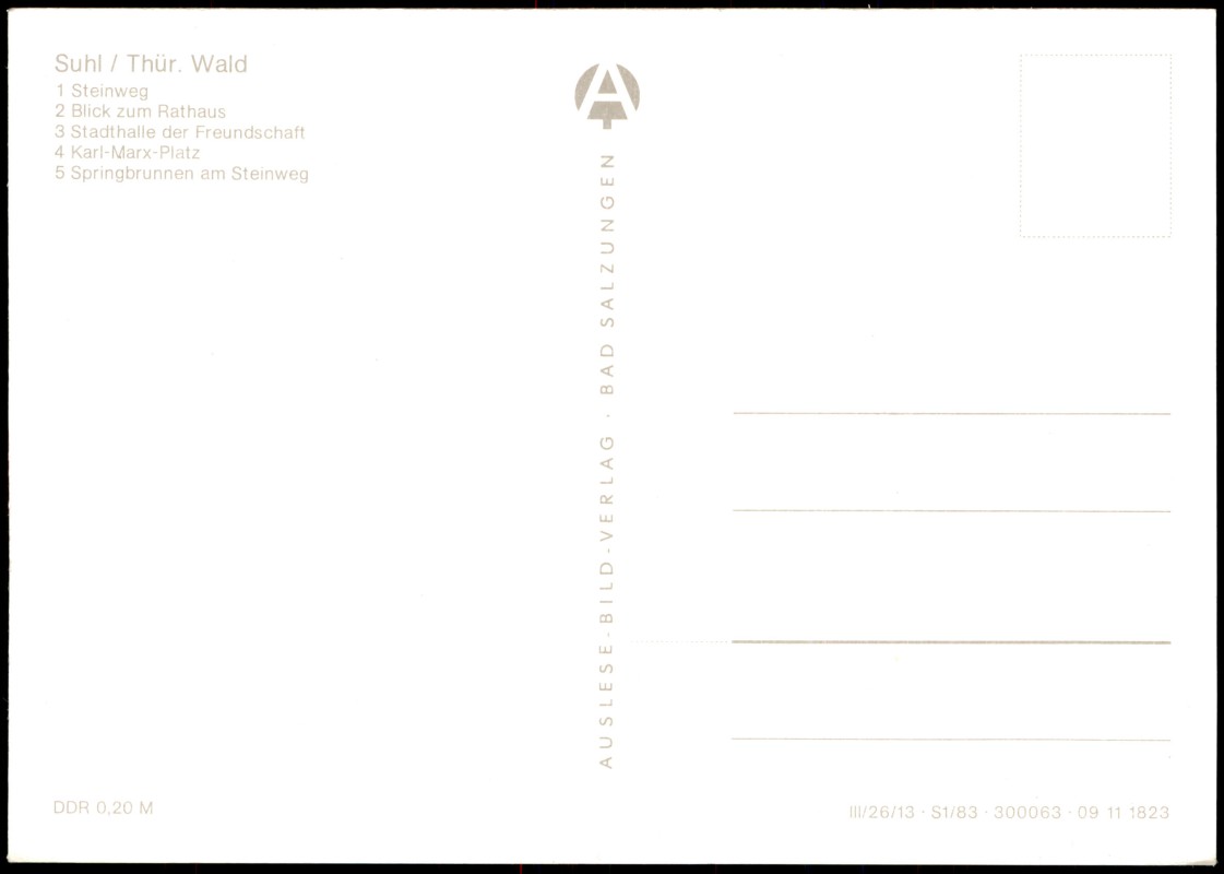 Postcart: Steinweg, Rathaus, Stadthalle der Freundschaft, Karl-Marx-Platz, Springbrunnen - Suhl