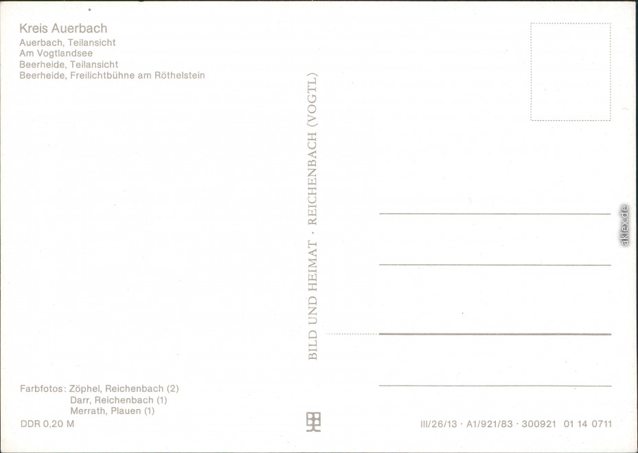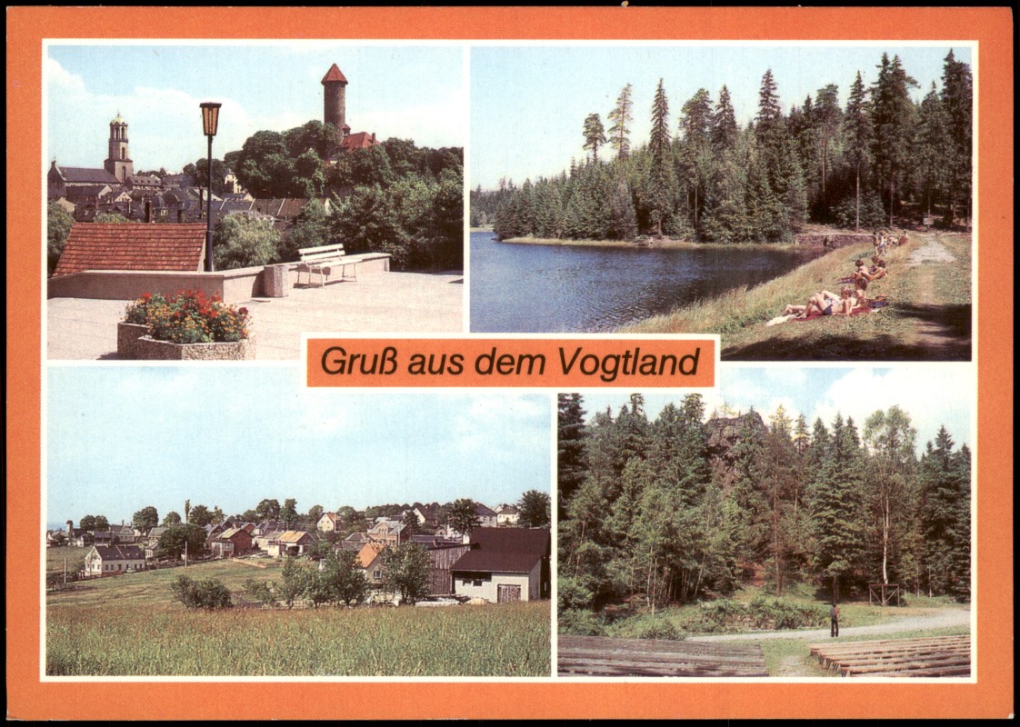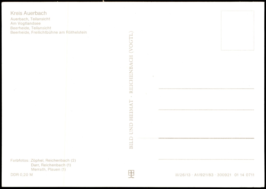 Postcart: Auerbach - Teilansicht - Vogtlandsee, Beerheide - Teilansicht - Freilichtbühne am Röthelstein - Auerbach (Vogtland)