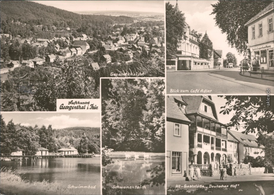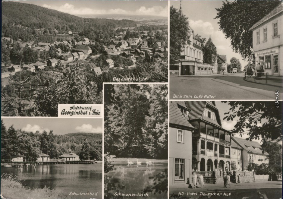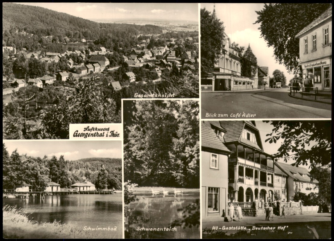 Postcart: Gesamtansicht, Café Adler, Schwimmbad, Schwanenteich, HO-Gaststätte Deutscher Hof - Georgenthal (Thüringen)