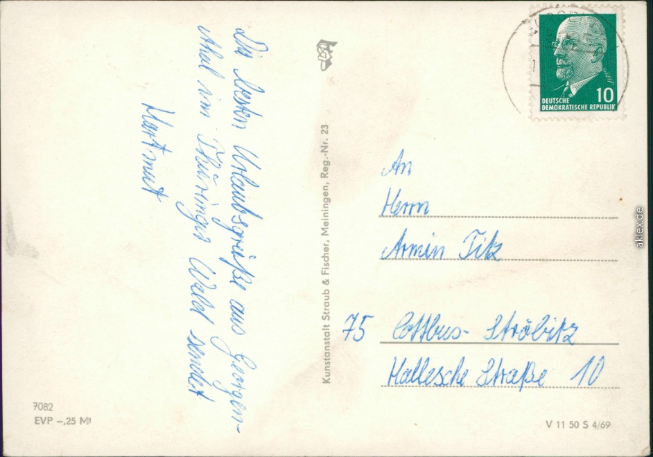 vintage Postcard from 1970: Gesamtansicht, Café Adler, Schwimmbad, Schwanenteich, HO-Gaststätte Deutscher Hof:: Georgenthal (Thüringen) Address side Detail image Detail image Detail image Detail image