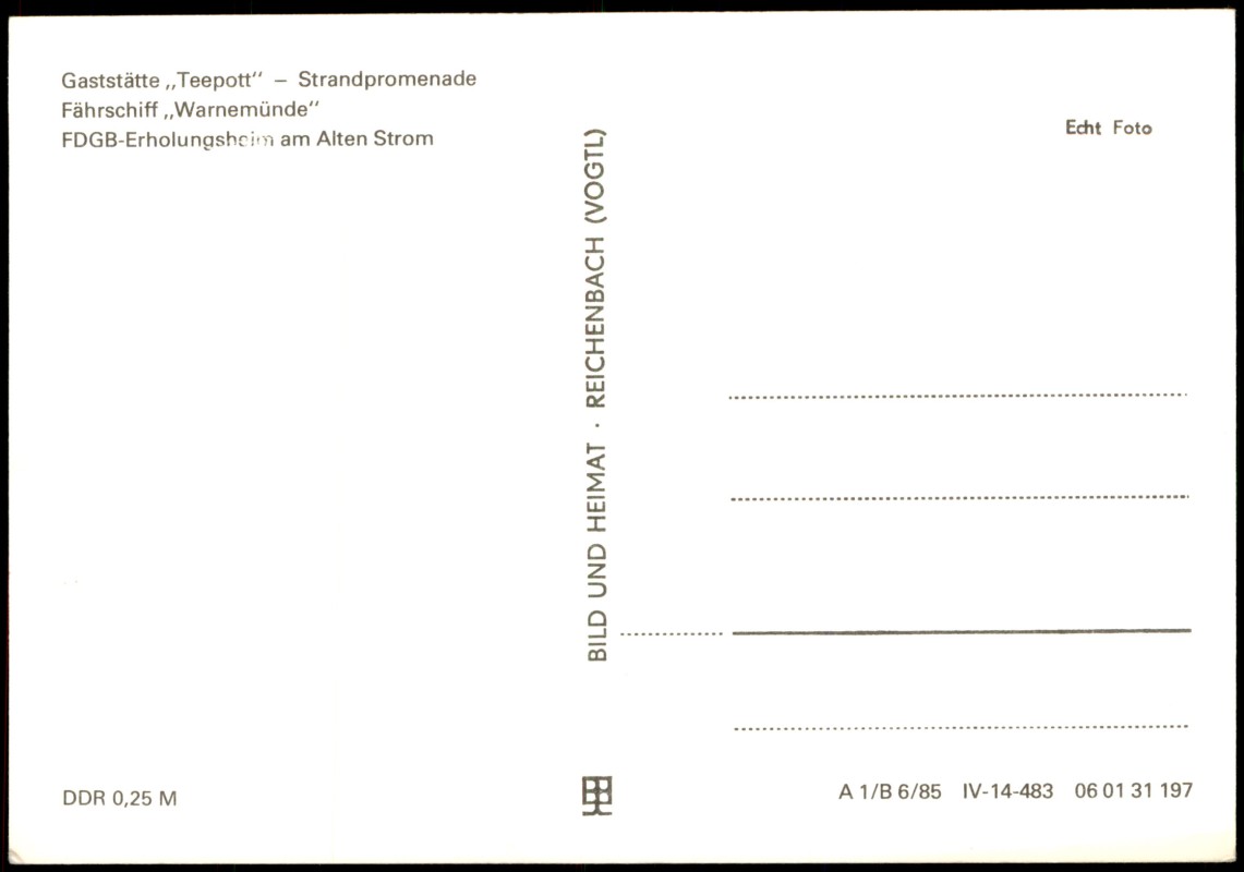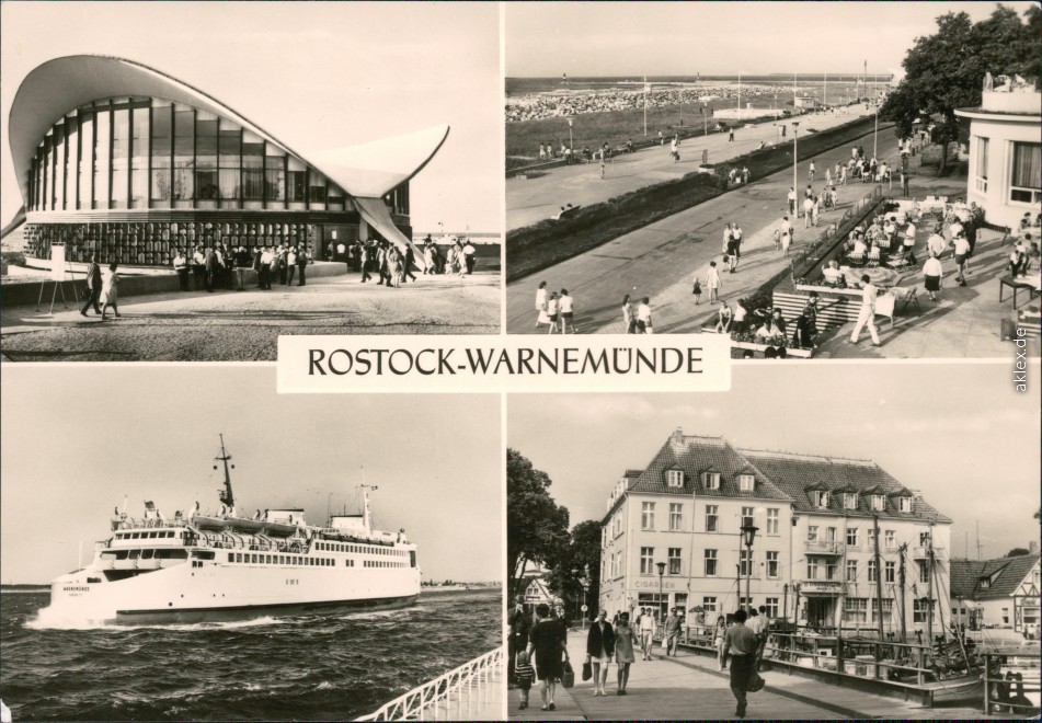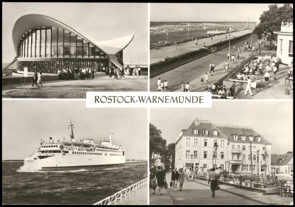 - Konsum-Gaststätte "Teepott", Strandpromenade, Fährschiff der DR "Warnemünde", FDGB-Erholungsheim am Alten Strom
