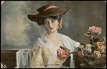 Künstlerkarte "Miss Olive May" elegante Frau mit Hut, Rosen