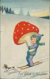 Neujahr Sylvester New Year Hund Junge auf Ski mit Riesenfliegenpilz