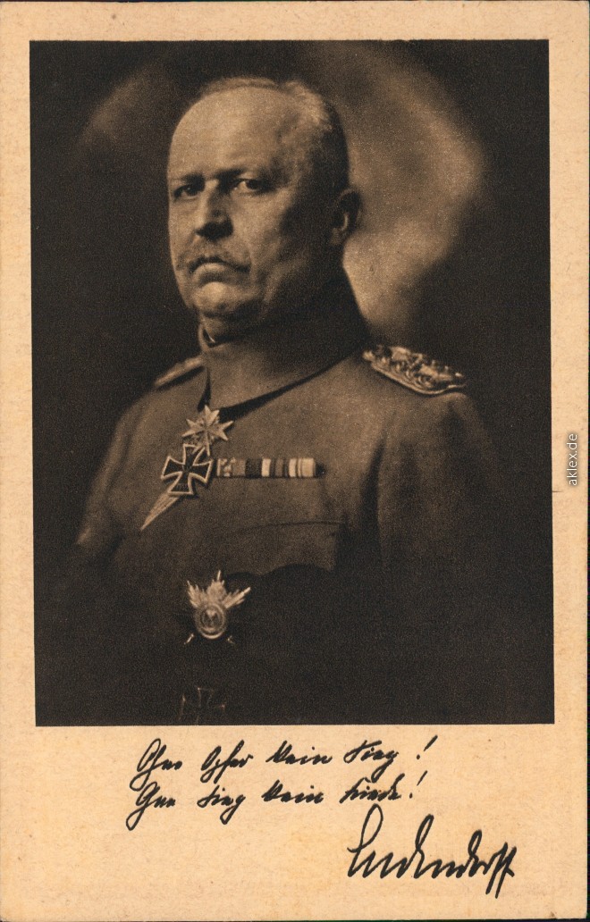 Postcart: Erich Ludendorff mit Pour le Mérite und Eisernem Kreuz und Ritterkreuz