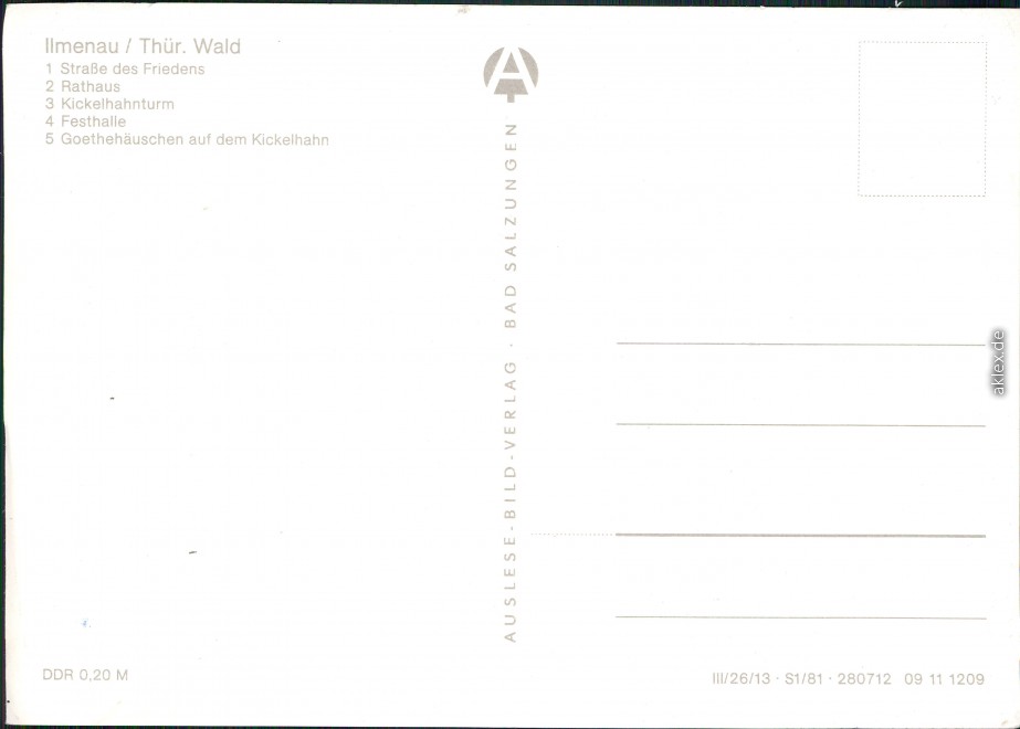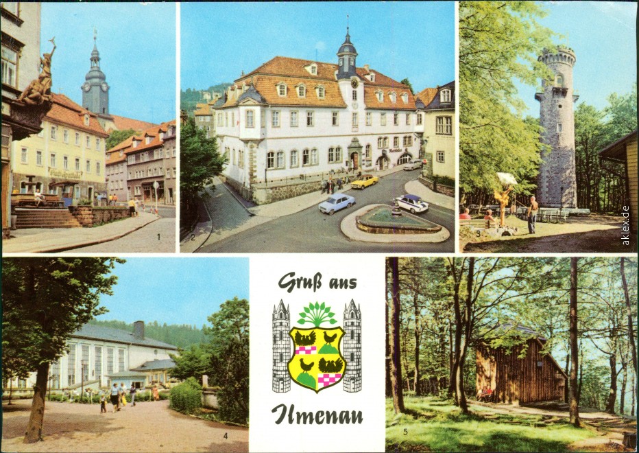 Postcart: Straße des Friedens, Rathaus, Kickelhahnturm, Festhalle, Goethehäuschen - Ilmenau