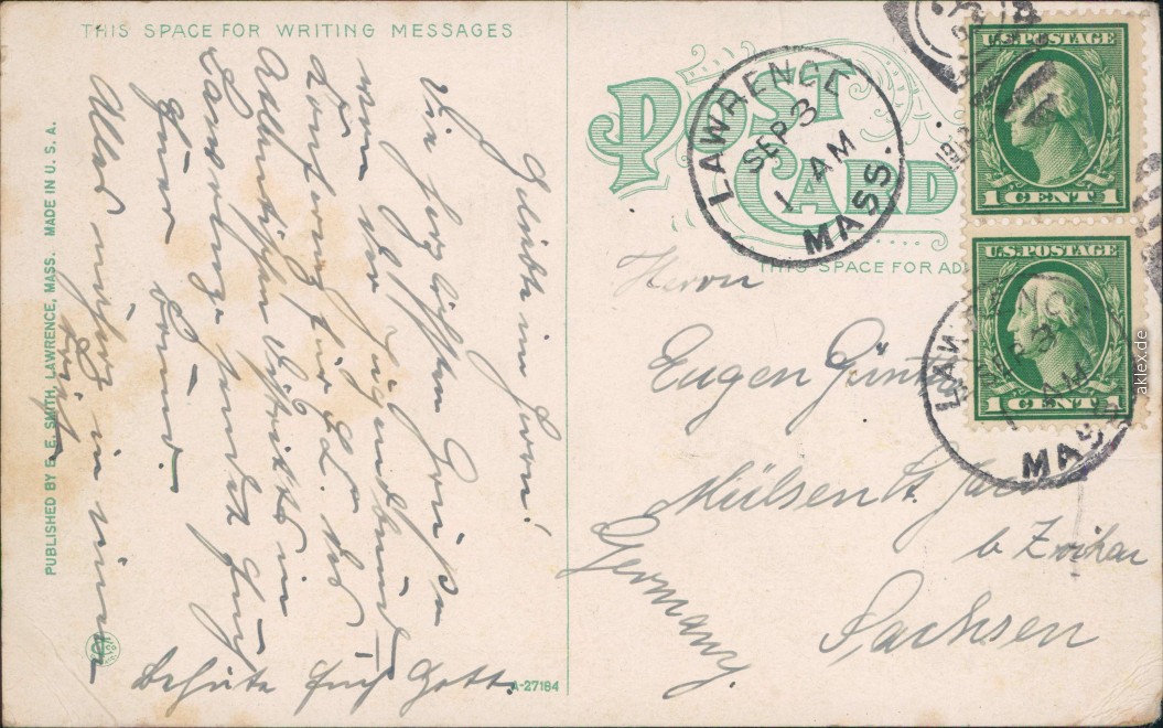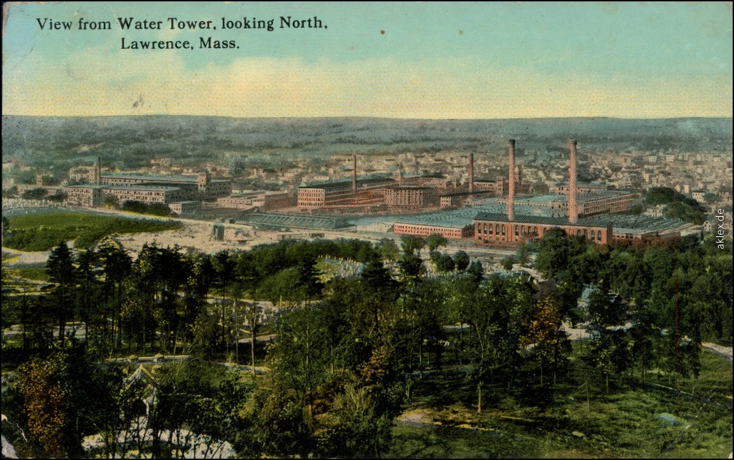 Postcart: Panorama-Ansicht - vom Wasserturm auf die Stadt mit Industrie (Schornsteine) - Lawrence