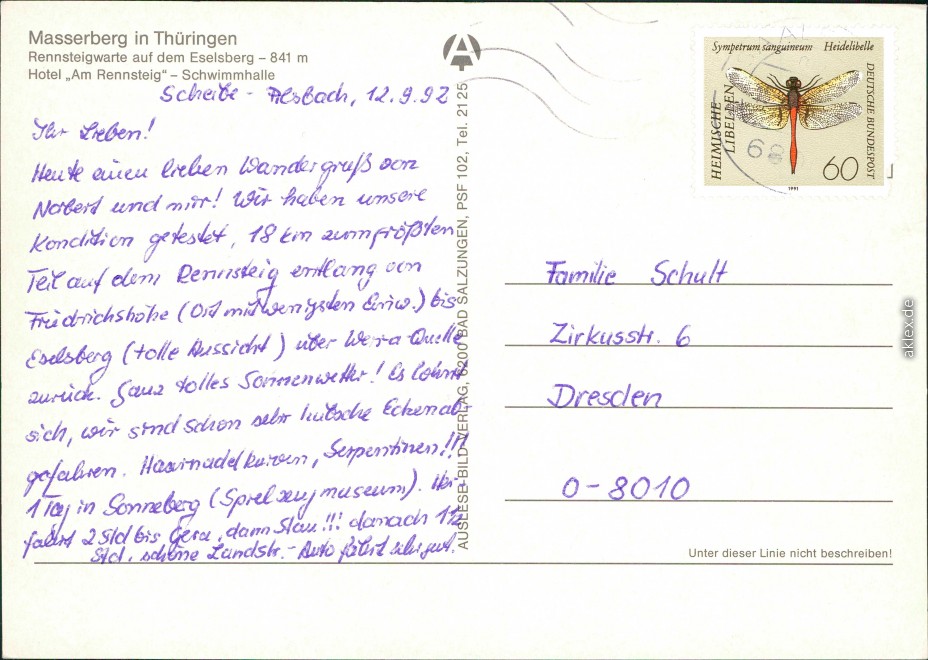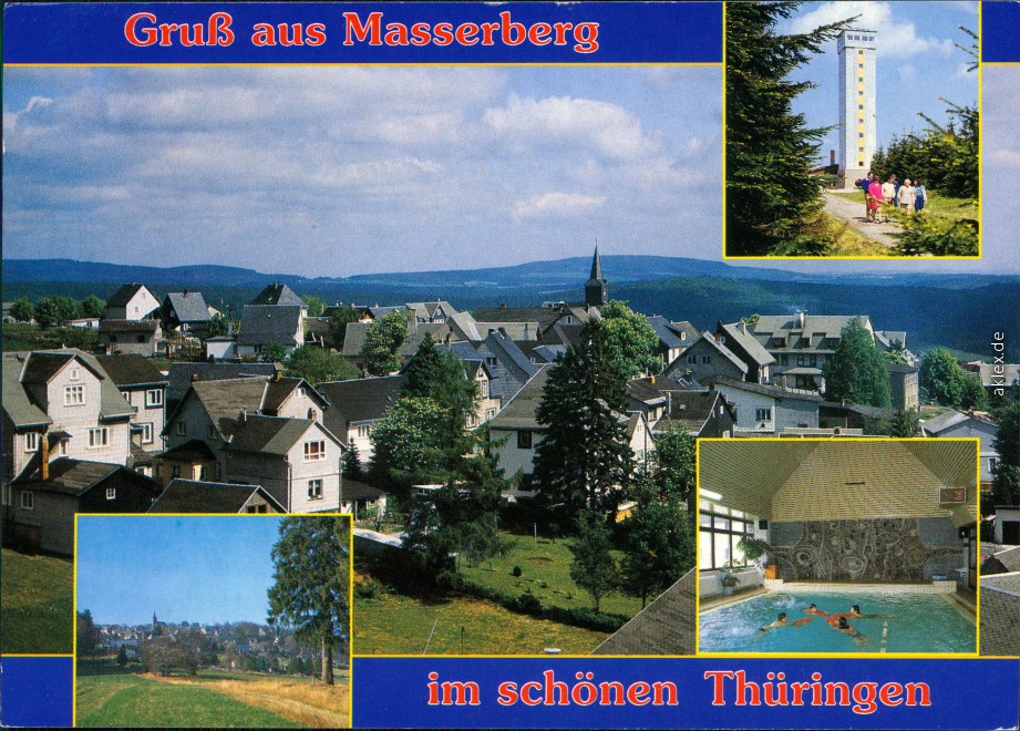 Postcart: Panorama, Aussichtsturm auf dem Eselsberg, Schwimmhalle - Masserberg