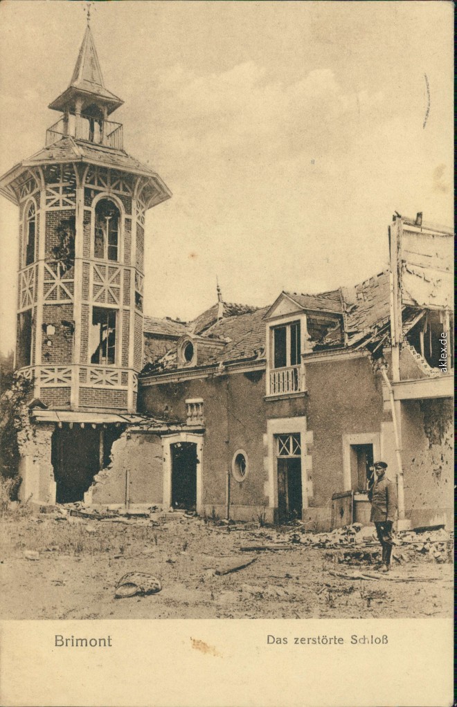 Postcart: Ansichten Erster Weltkrieg - Das zerstörte Schloß mit Soldat - Brimont (Marne)