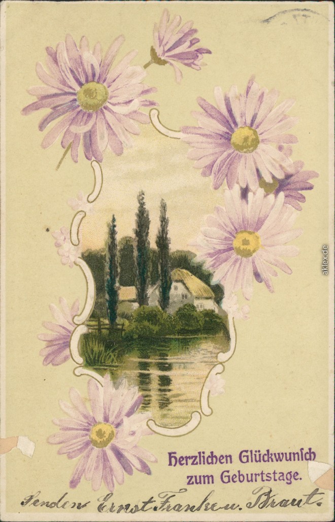 Postcart: Glückwunsch/Grußkarten: Geburtstag - Gemalte Blumen, Haus am See