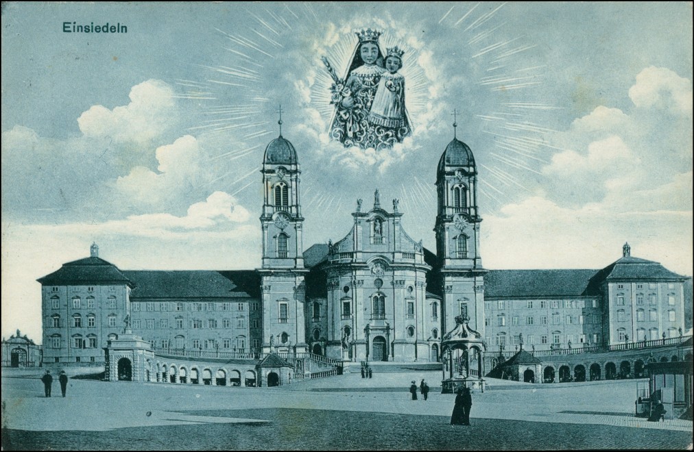 Postcart: Maria und Jesus über dem Kloster - Einsiedeln