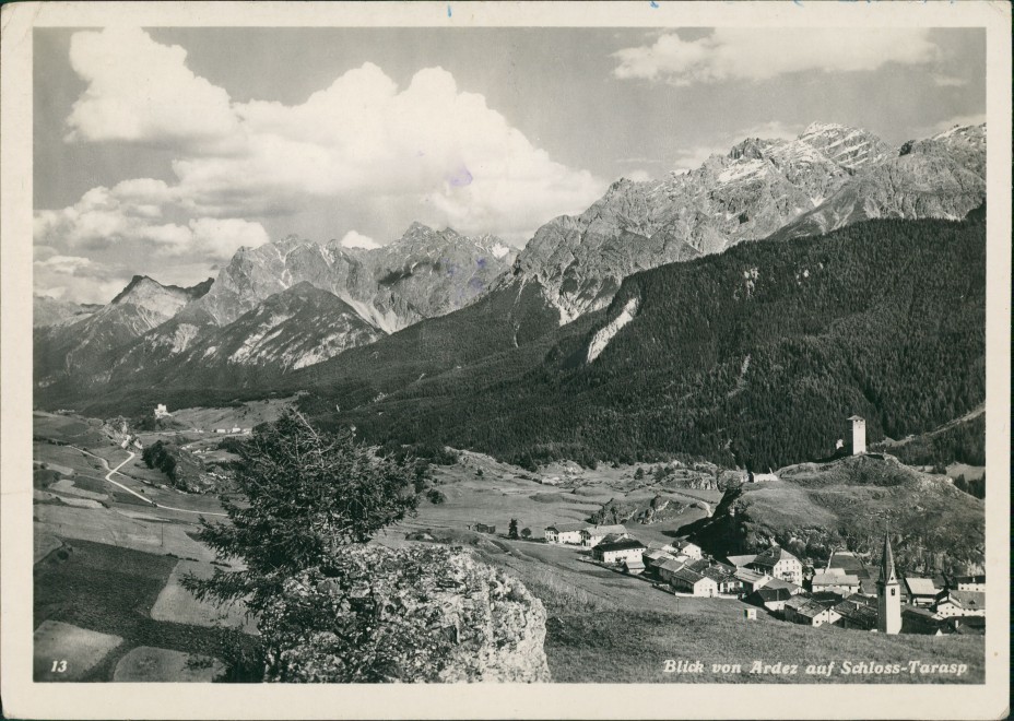 - Blick von Ardez auf Schloss Tarasp, Berge Alpen Panorama