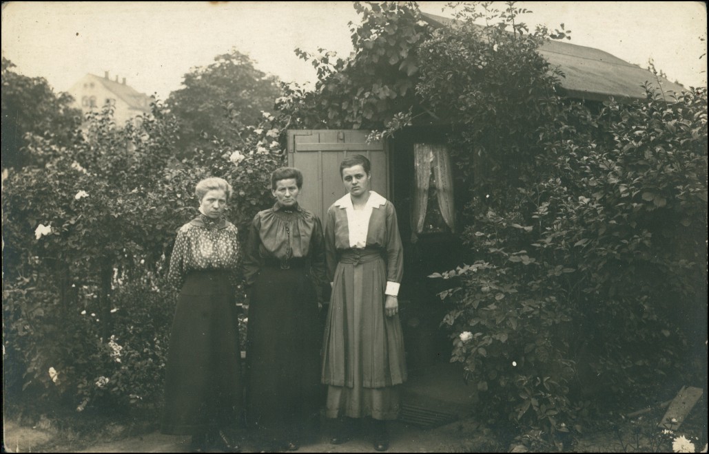 - Schrebergarten/Kleingarten Frauen vor Gartenlaube Zeitgeschichte