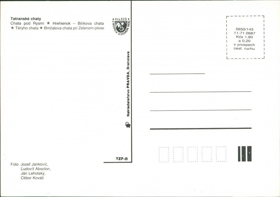 - Tatranské chaty: Chata pod Rysmi, Hrebienok, Téryho, Brnčalova