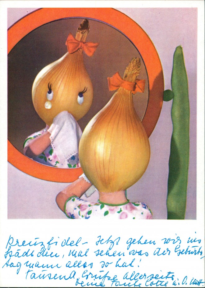 Figuren aus Gemüse - Ziebelfrau im Spiegel