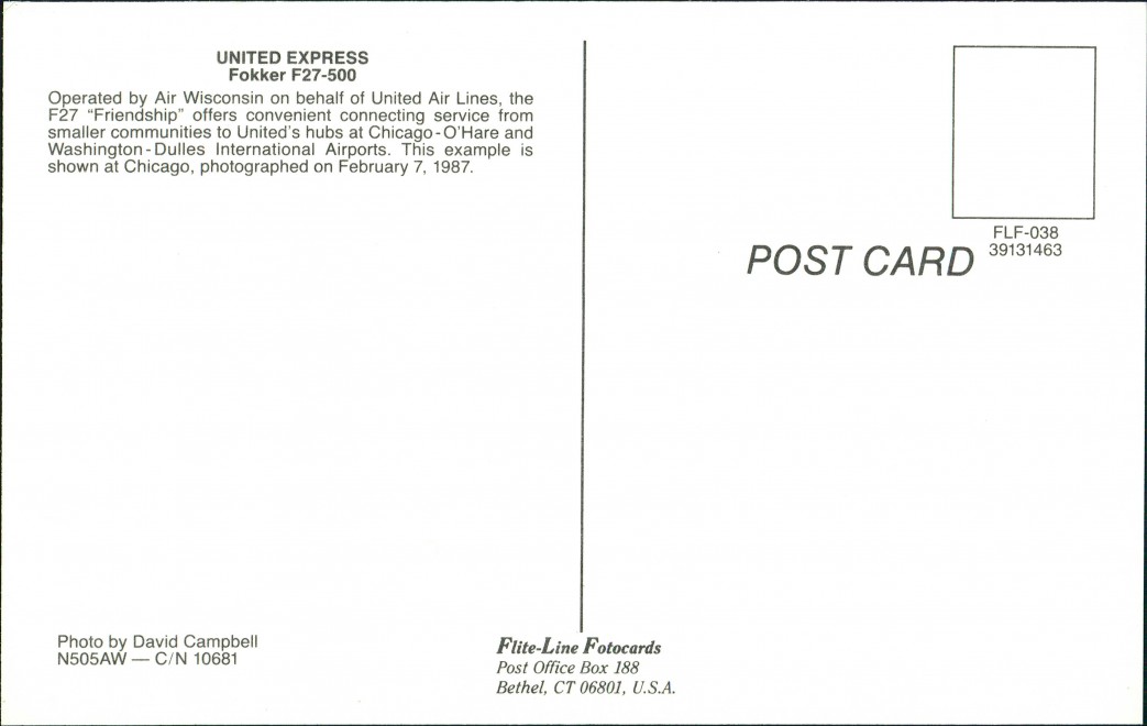 - UNITED EXPRESS Fokker F27-500 Operated by Air Wisconsin on behalf of United Air Lines, the F27 "Friendship" offers convenient connecting service from smaller communities to United's hubs at Chicago - O'Hare and Washington Dulles International Airports. This example is shown at Chicago, photographed on February 7, 1987. FLF-038 39131463 POST CARD 3515190 Photo by David Campbell N505AW - C/N 10681 Flite-Line Fotocards Post Office Box 188 Bethel, CT 06801, U.S.A.