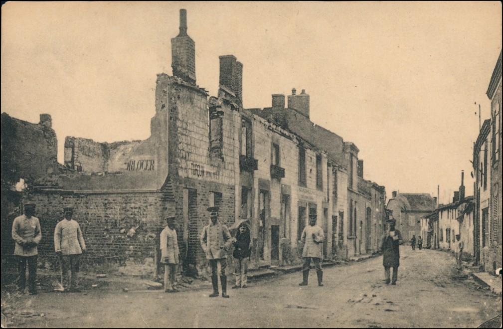- Soldaten vor zerstörten Häusern, Westfront 1. Weltkrieg