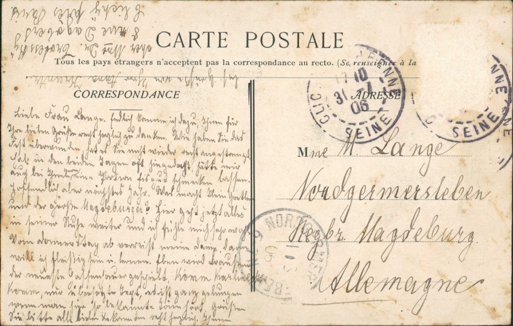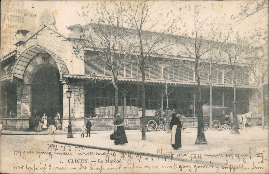 Postcart: Straßenpartie am Markt - Kutschen - Clichy
