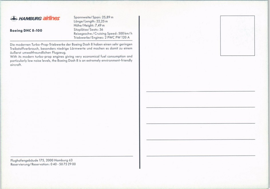 Postcart: HAMBURG airlines Boeing DHC 8-100 Flugwesen - Flugzeuge