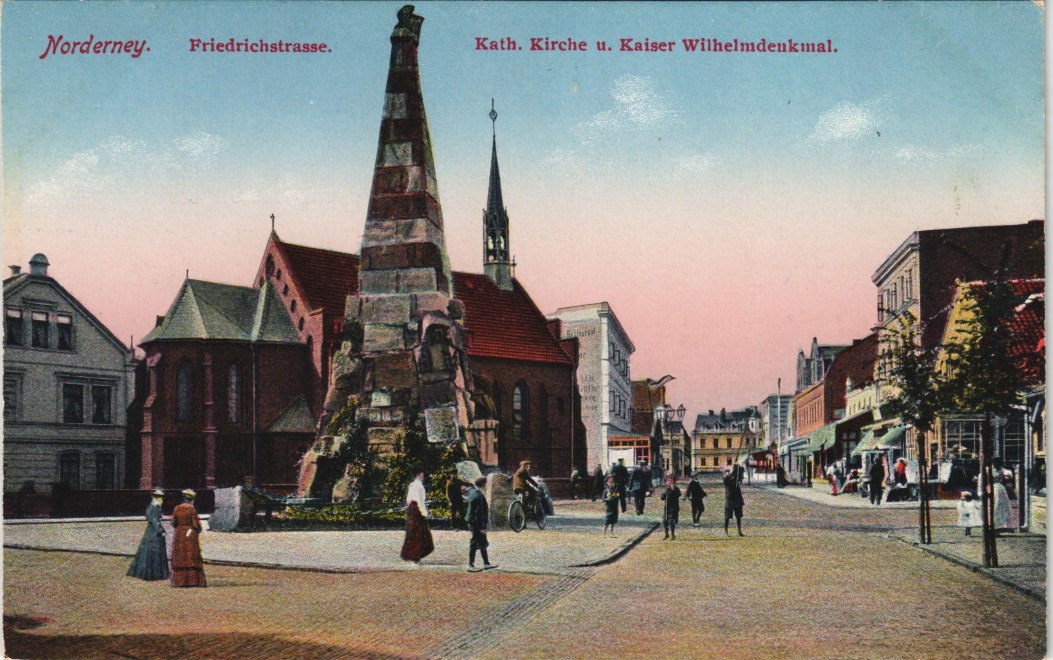Postcart: Friedrichstrasse Kath. Kirche u. Kaiser Wilhelmdenkmal - Norderney