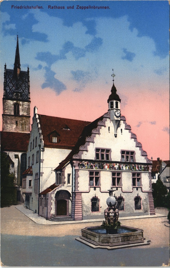 Postcart: Rathaus und Zeppelinbrunnen. - Friedrichshafen