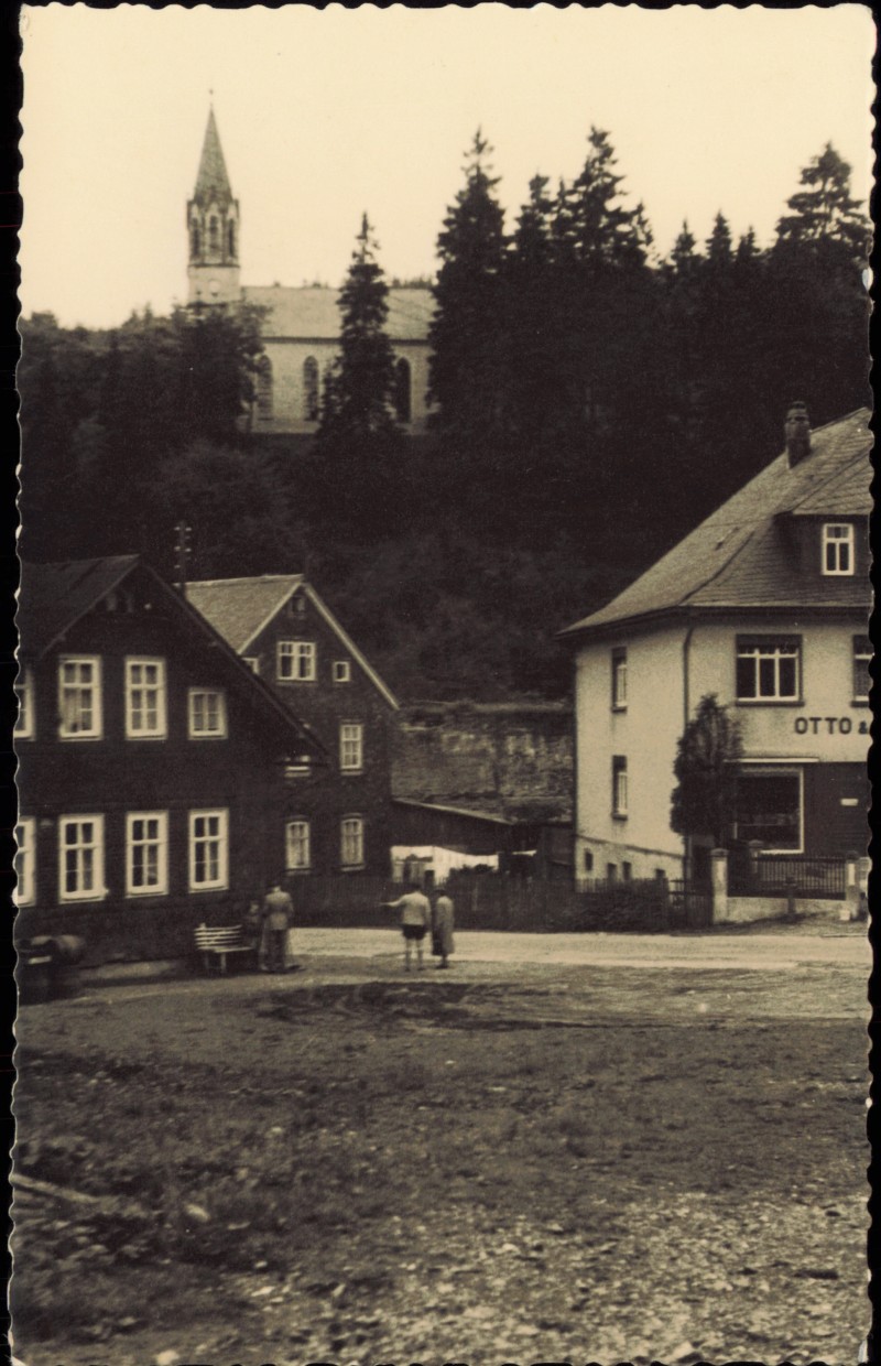 Ansichtskarte Stadt, Geschäft - Kirche - Fotokarte 1956