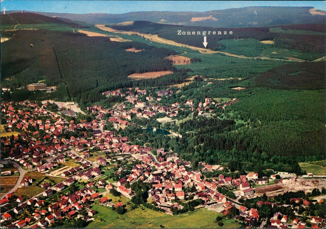 Postcart: Luftbild mit Markeirung der Zonengrenze - Braunlage