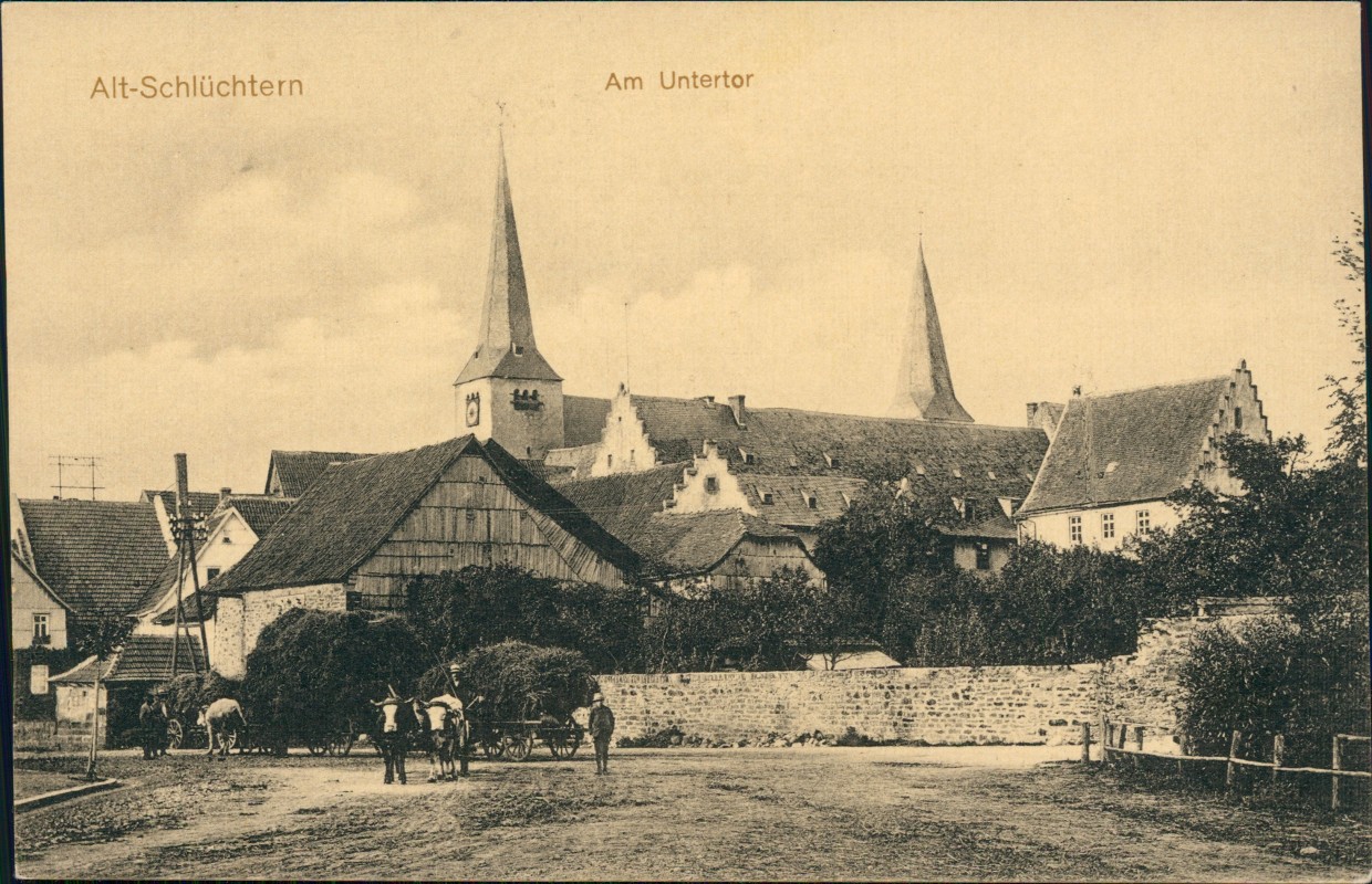 Postcart: Am Untertor, Straße mit Ocsenfuhrwerk - Schlüchtern