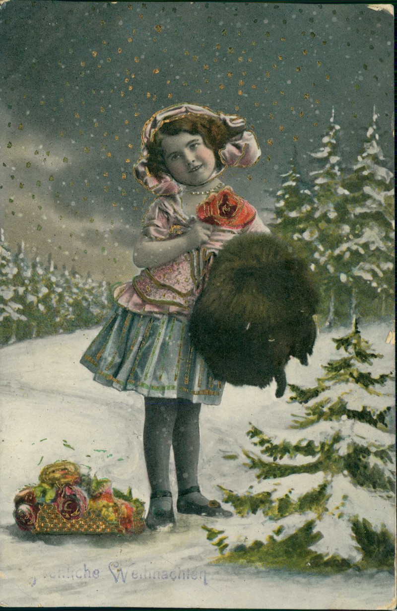 Postcart: Weihnachten - Christmas Mädchen in feiner Kleidung im Wald