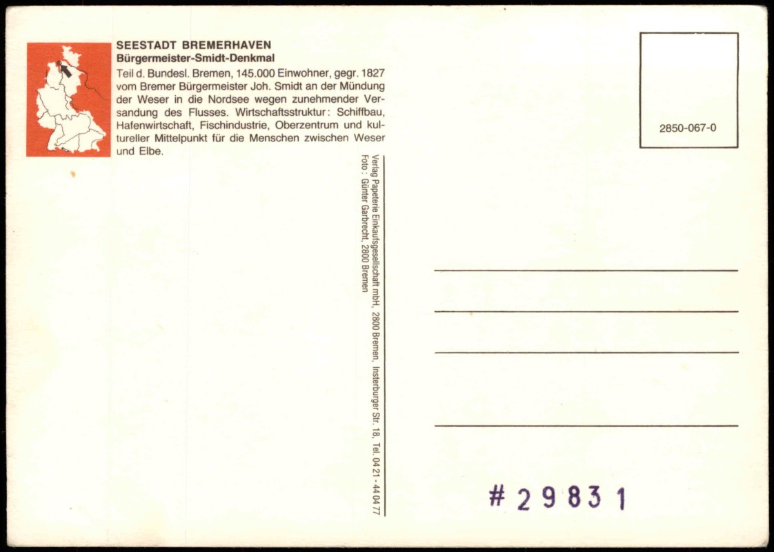 Photo Card: Bürgermeister-Smidt-Denkmal, Auto VW Käfer vor Geschäft - Bremerhaven