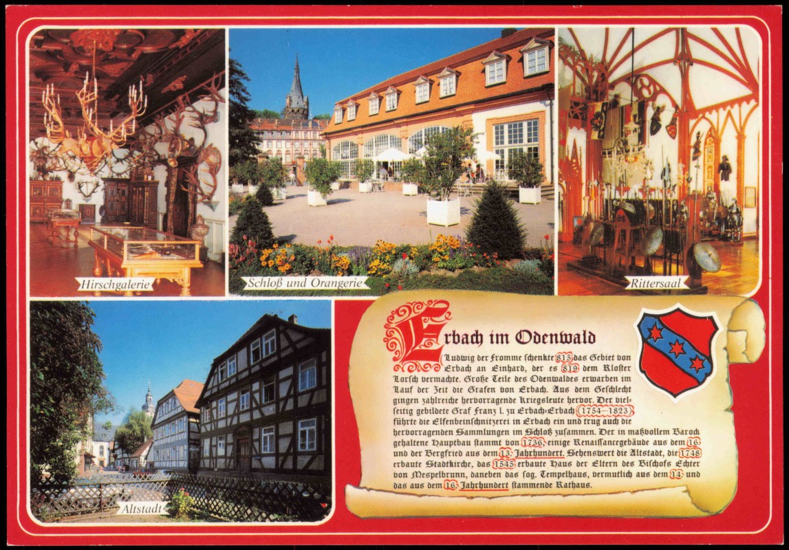 Postcart: Hirschgalerie Rittersaal Altstadt - Chronikkarte - Erbach (Odenwald)
