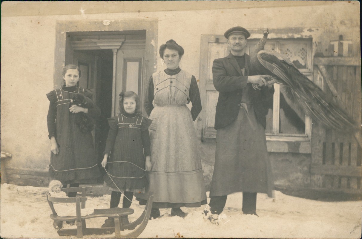 - Familien Gruppenfoto Kinder mit Schlitten Vater mit Fasan