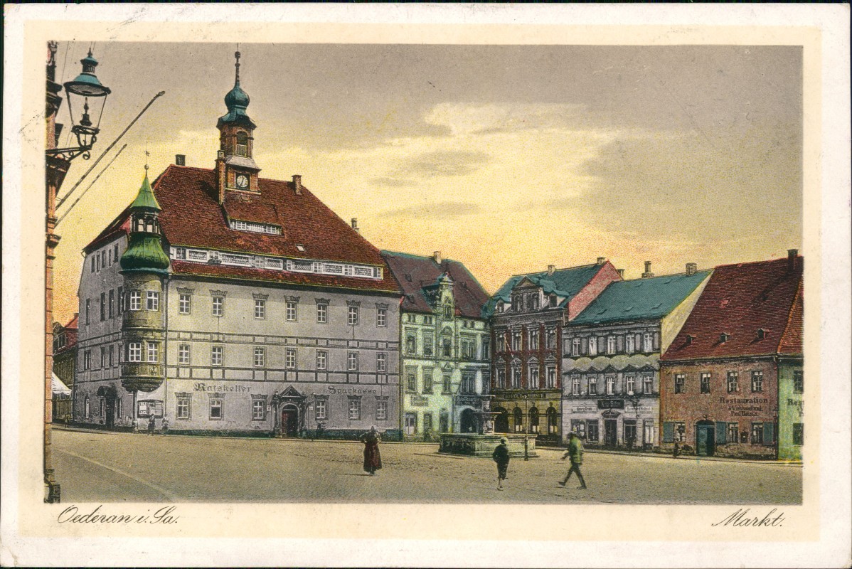 Postcart: Marktplatz Markt Partie am Ratskeller mit Sparkasse - Oederan