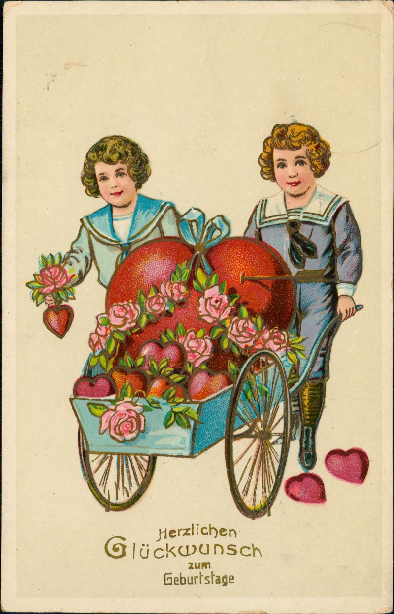 - Glückwunsch Geburtstag Birthday Jungen mit Riesenherz in Schubkarre