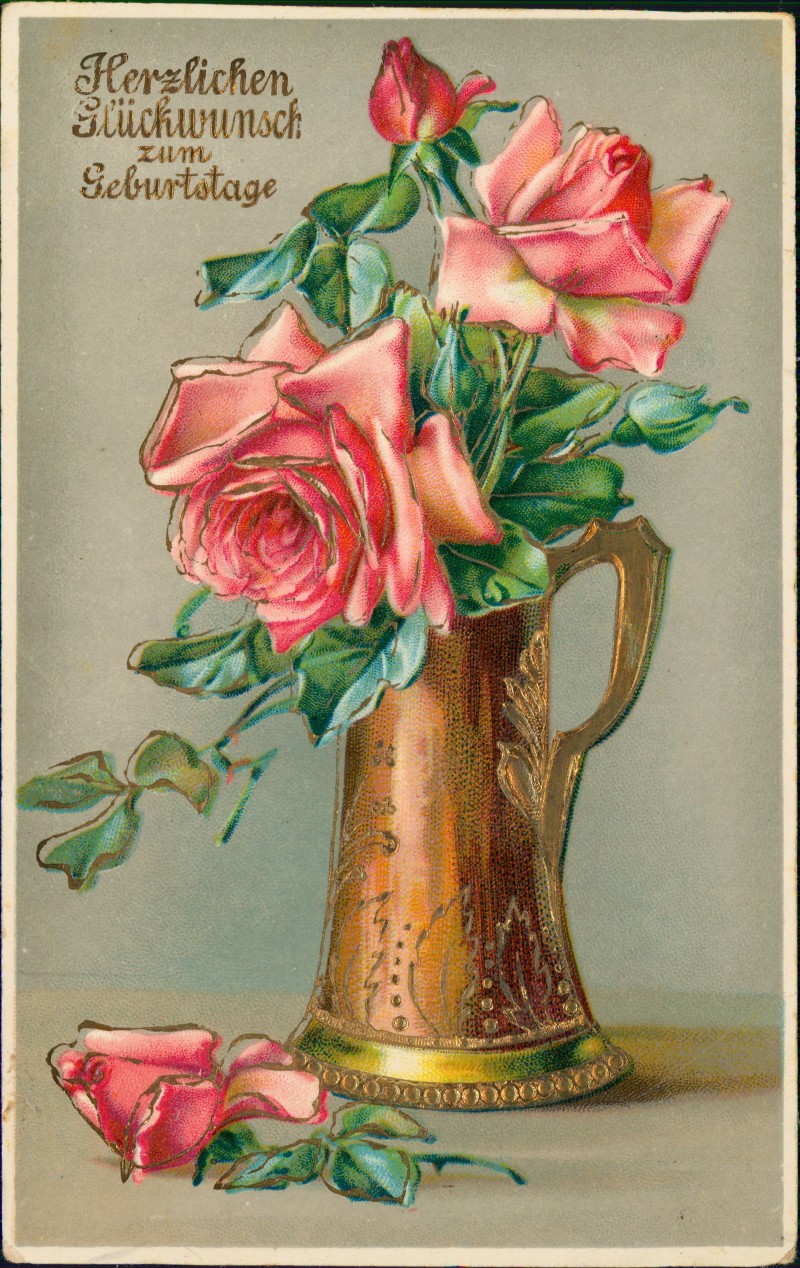 Postcart: Glückwunsch Geburtstag Birthday Goldkanne Rosen