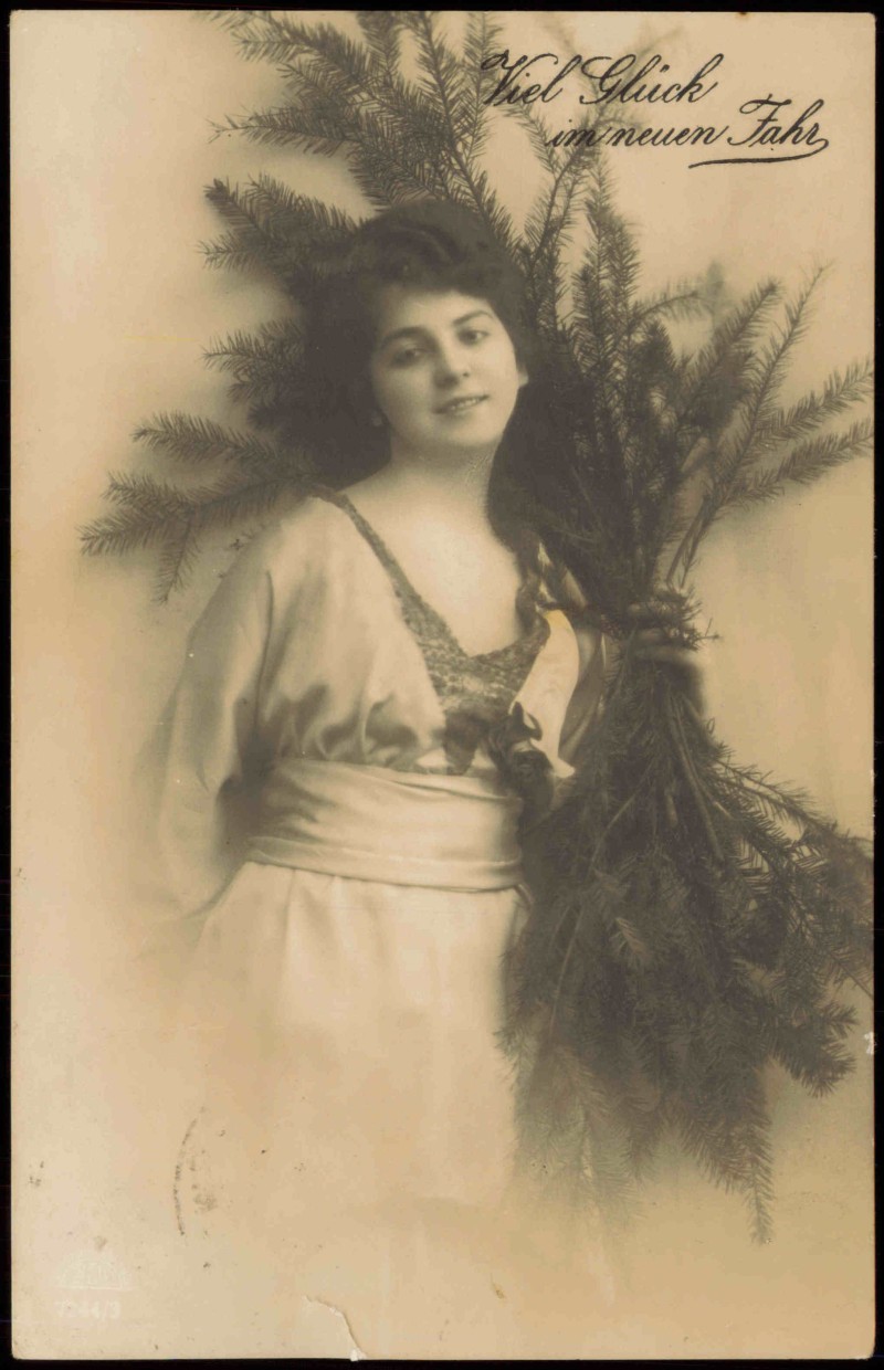 Postcart: Neujahr Sylvester New Year schöne Frau mit Tannenzweigen Fotokunst