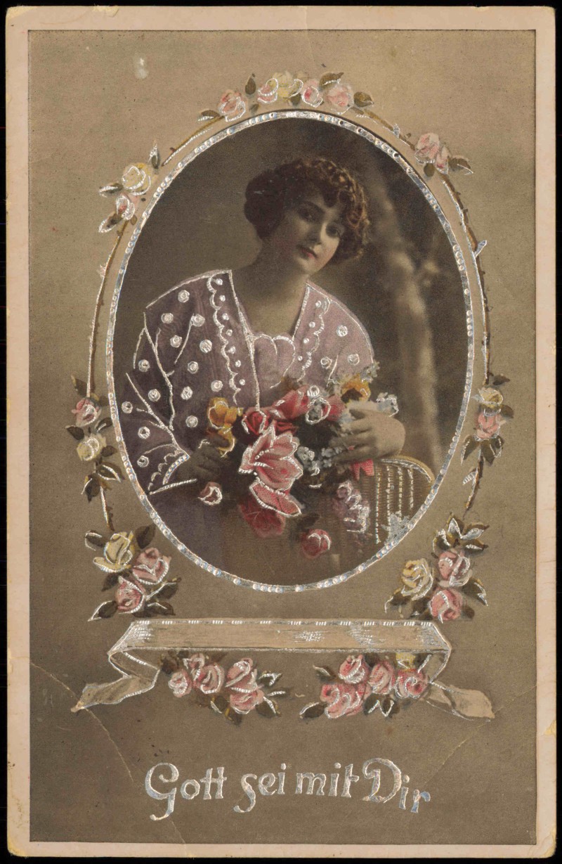 Postcart: Künstlerkarte Frau im Medaillon Rosen