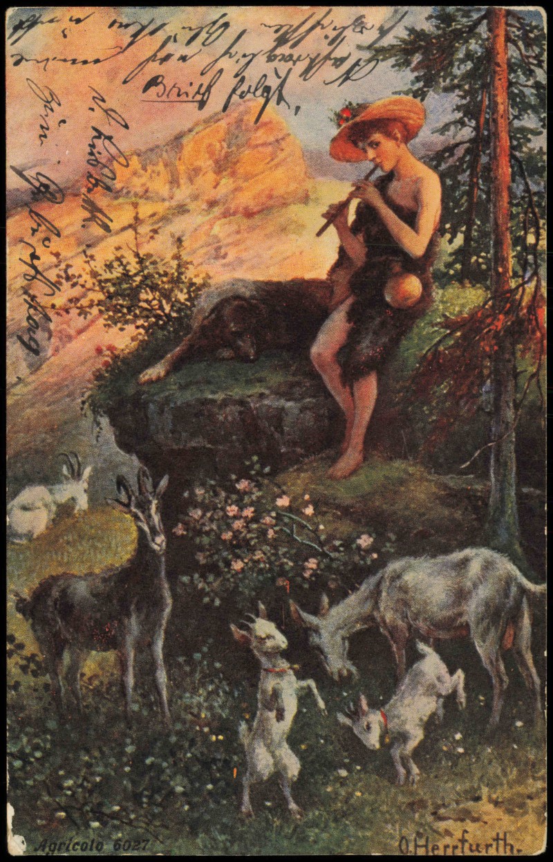 Postcart: Künstlerkarte Flötenspieler Ziegen Agricolo