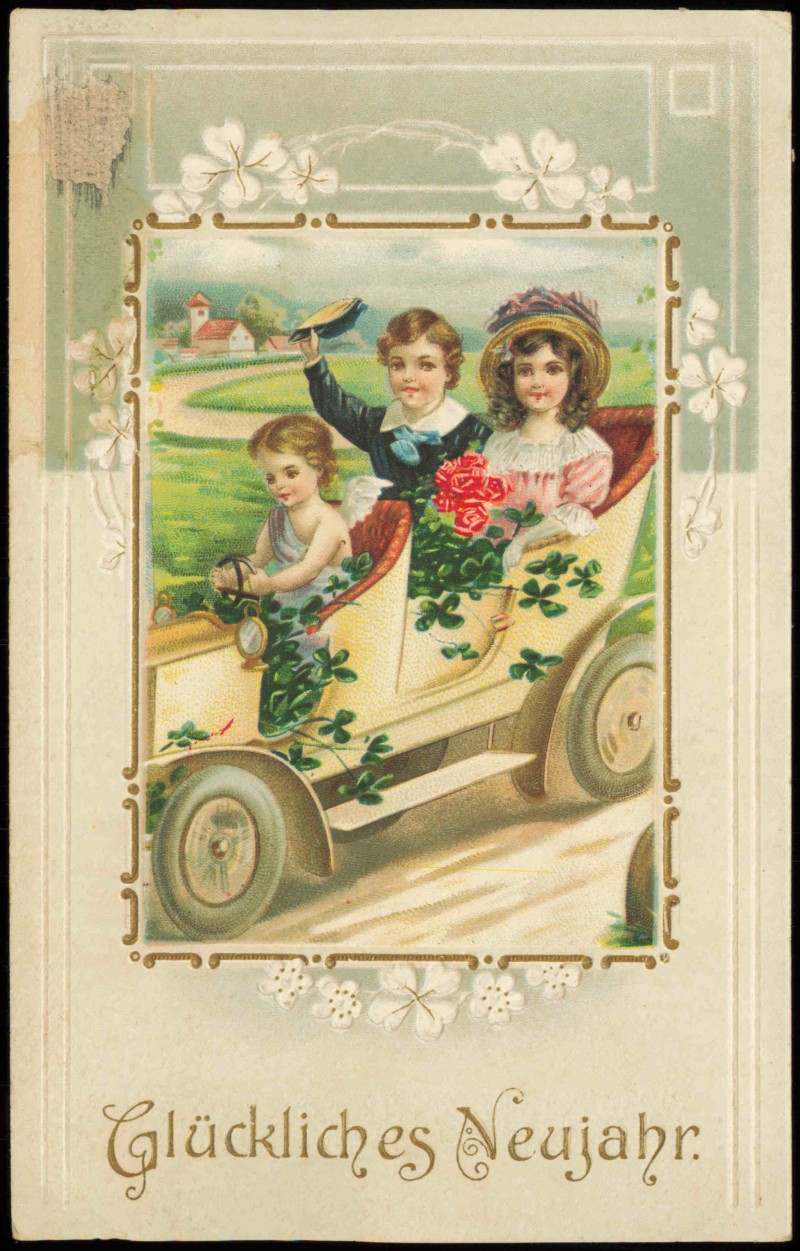 Postcart: Neujahr Sylvester New Year Engel Junge Mädchen im Auto