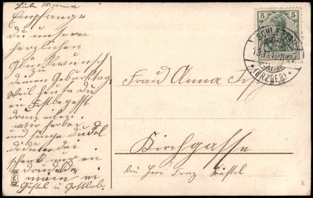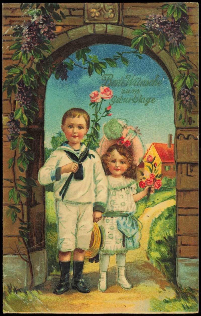 Postcart: Geburtstag Birthday Junge und Mädchen am Tor